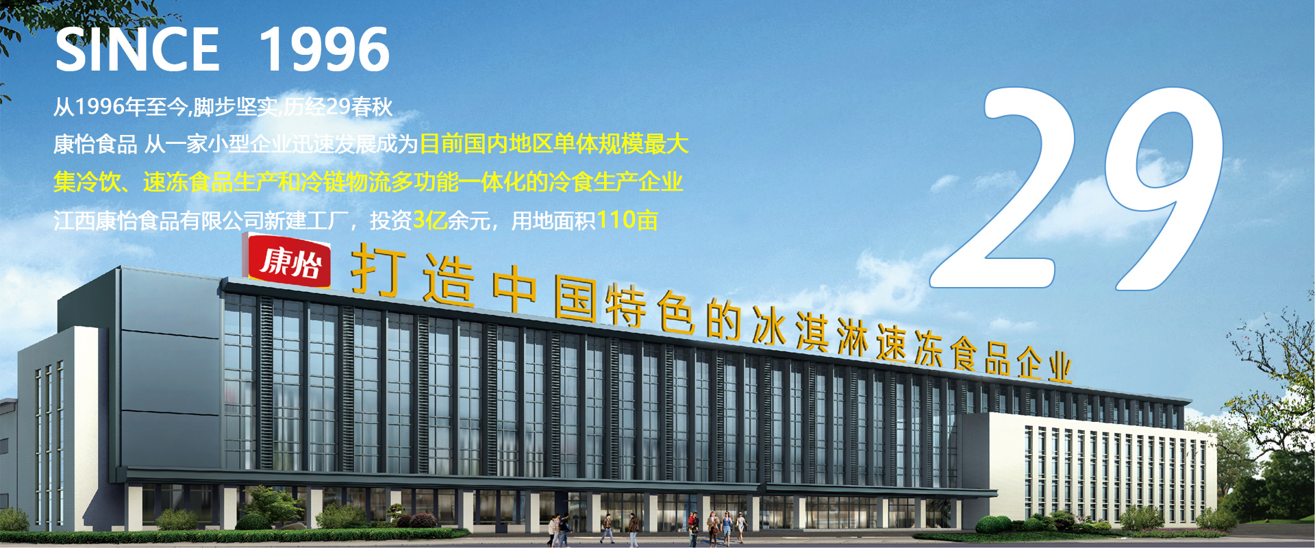 江西康怡食品有限公司始于1996年,由浙江客商投資興建,專業(yè)生產冰淇淋、雪糕、冰棒的冷凍食品生產企業(yè)。企業(yè)先后通過ISO9001、HACCP、ISO22000等多種質量體系認證,是國家質量技術監(jiān)督局批準的《市場準入證》并榮獲《中國馳名商標》《江西省著名商標》、《江西名牌產品》《江西暢銷產品》、《國家高新技術企業(yè)》、《全國食品安全百佳先進單位》、《消費者最受歡迎的產品》、《誠信企業(yè)》等多項榮譽稱號。公司運行多年來,經營業(yè)績、經濟與社會效益高速增長。2019年6月,在市委、市政府的支持下,康怡公司新建集冷食生產和冷鏈物流于一體的大型現代化基地,公司座落在樟樹市藥都科技產業(yè)園,地理位置優(yōu)越、交通便利,總投資3億,占地面積110畝,建筑面積7.8萬平方米;綠化率21%;容積率1.16;建筑密度54%。投產后日總產能450噸,其中,冰淇淋350噸、速凍食品100噸。年總產能5萬噸,其中冰淇淋3.5萬噸、速凍食品1.5萬噸;年產值6個億,年納稅5000多萬元。預留二期,未來可突破年總